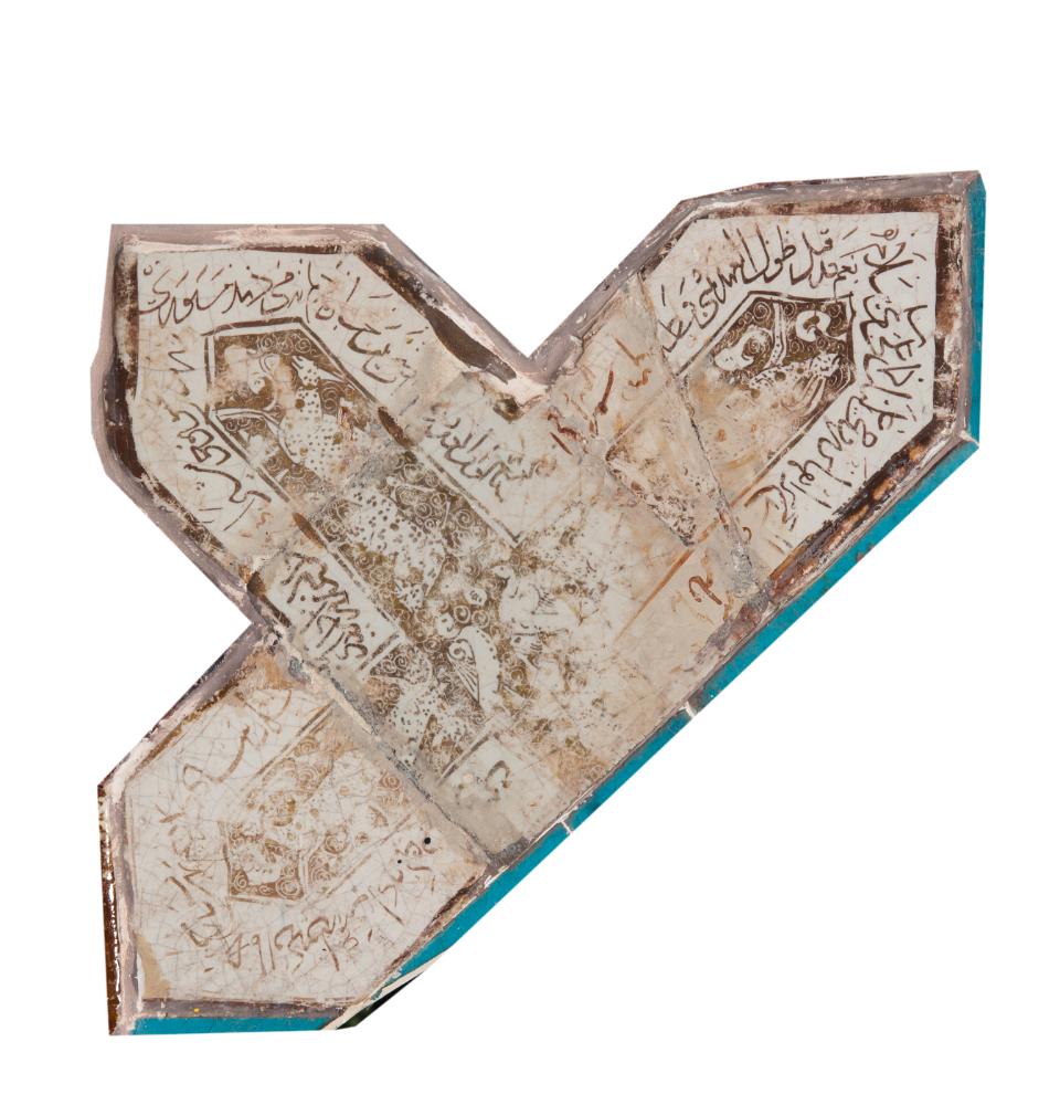 Partial Lusterware Cross Tile with Palmette Motifs and Inscription